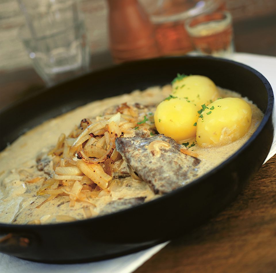 - Legg løken over kjøttet og server hvalbiffen med kokte poteter eller potetstappe.
